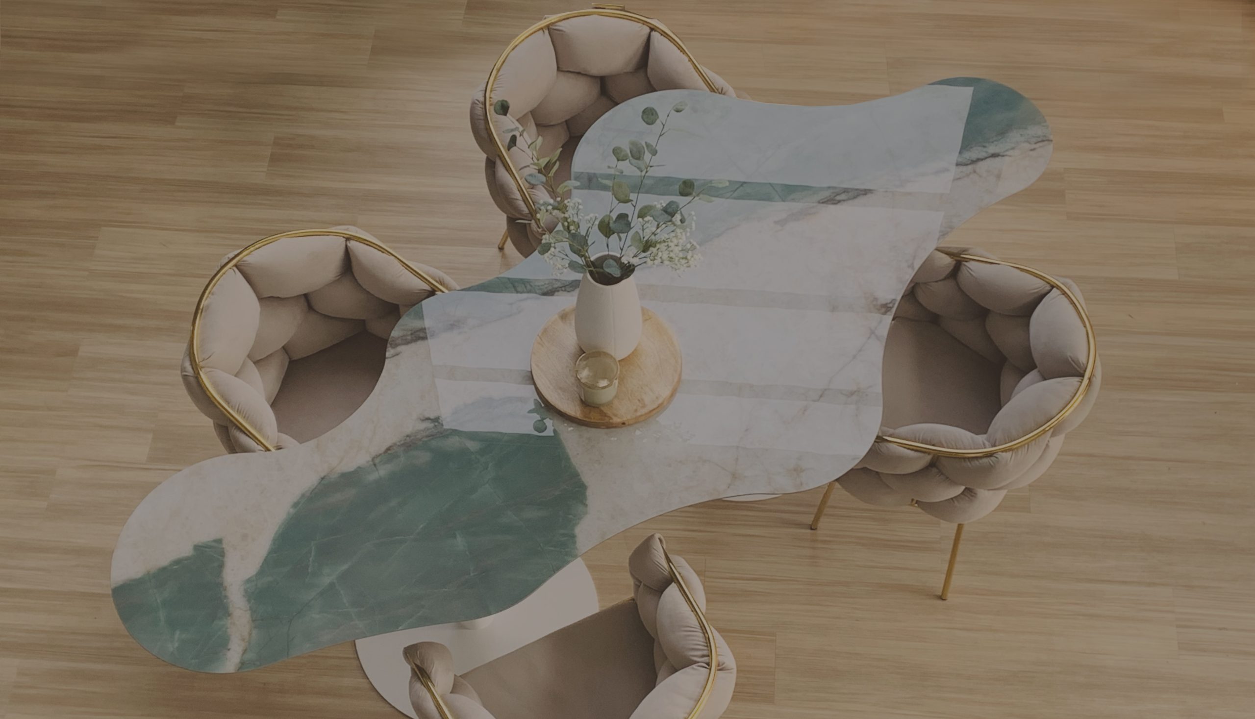 Réalisation de plateaux de table en céramique effet Calacatta, en fine épaisseur, montés sur piètement.